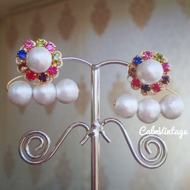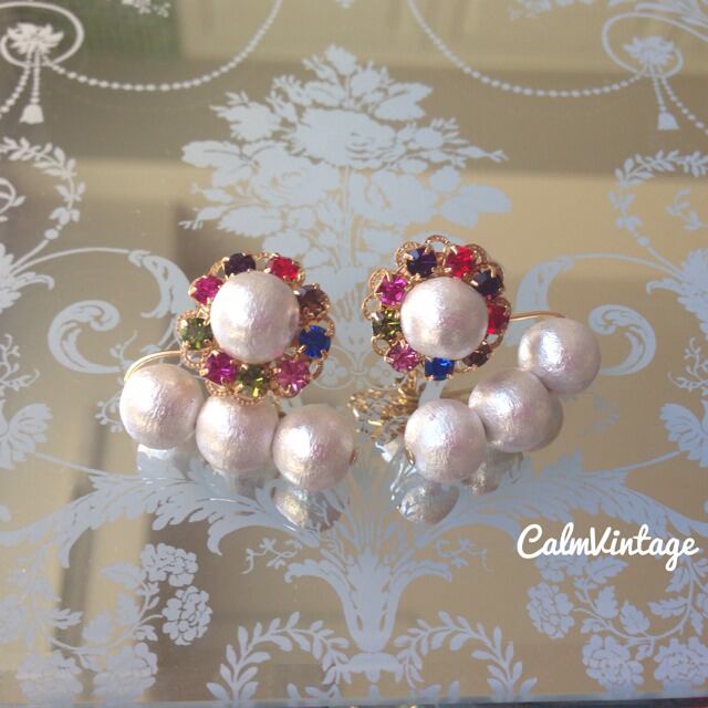 付け方はマルチカラーパールをはめて、後ろからコットンパールを挟んでキャッチを付けていただく感じです♡